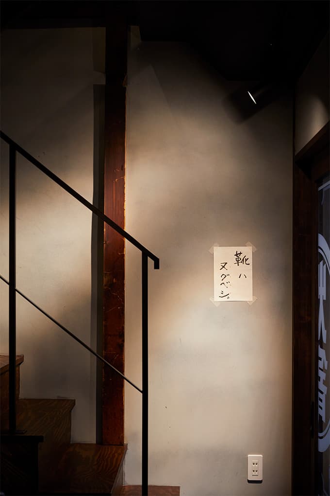 物件はかなり古びた木造の一戸建てで、解体可能な部分をほとんど解体するところから始まりました。解体で出て来た古い壁をそのままむき出しにするなど、古民家のリノベーションならではの味を出すことを意識しています。また「路地ノ裏 灯篭」という店名をストレートに表現するために、路地に店内の照明があふれ出すような照明計画を検討しました